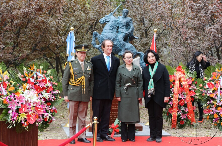 【公共外交网讯】11月27日,为庆祝南美洲“解放者”、阿根廷国家英雄何塞·德·圣马丁将军雕像落户北京朝阳公园,阿根廷驻华使馆和北京金台艺术馆联合举办了庄重的揭幕仪式。拉美使团各国大使、使节及武官,拉美在华侨民,中国外交部拉美司、中国文化部等政府官员、中国原驻拉美外交官、中阿(根廷)商会驻京代表等社会各界友好人士应邀出席本次活动。