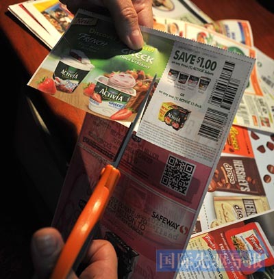 如今,大量的商家优惠券如雨后春笋般出现在欧美。图为一位女士正在剪下报纸里一张优惠券。法新社