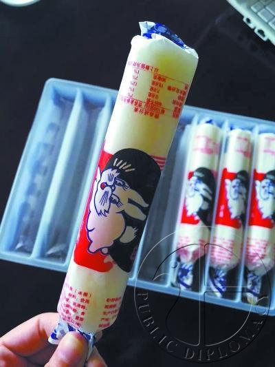 在北京的南锣鼓巷、工体附近的小店都能找到这种“大白兔雪糕”的身影,外包装看起来几乎和大白兔奶糖一样,白色的小兔子,蓝色的花边。打开后,是一种奶白色的冰棍,吃起来和普通奶油雪糕味道差不多。售卖大白兔雪糕的冰柜上贴着宣传标语“大白兔雪糕小时候的味道”。
