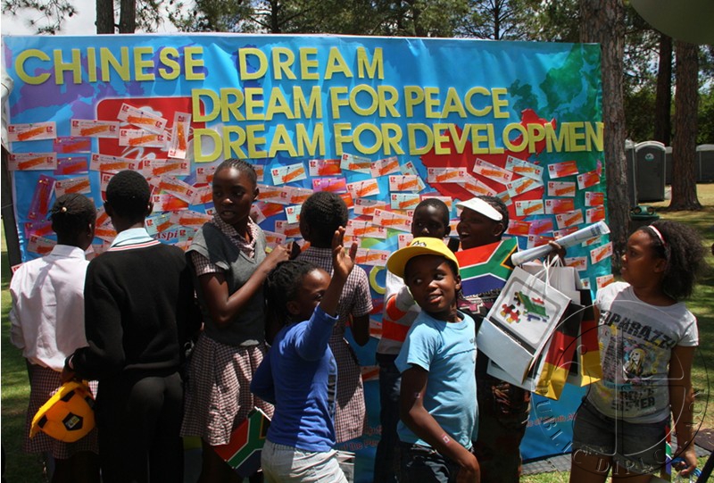 具有浓厚中国文化特色的中国展台吸引了大量南当地民众及驻南使团人员。我馆和人民网、南非365网站共同组织的中南人民“梦想展示”成为重要亮点。展台播放“中国梦”宣传片,并设立“中国梦:和平之梦、发展之梦、人民之梦”的主题“梦想墙”,邀请南非民众填写梦想卡片,并在摄像机前与中国民众分享。大家在留下对自己、社会和国家梦想的同时,纷纷表示祝愿中国、南非和自己都能梦想成真。“梦想墙”成为了中南人民梦想汇聚和友情交融的海洋。