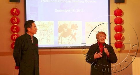安提达女士代表国画班学员作了发言,她感谢中心提供的学习中国画的机会,使她在时隔25年后又能重新拿起画笔,并且在老师的指导下创作出令她本人都难以置信的作品。她希望中心今后继续举办各种中国文化培训,并祝愿中心未来发展越来越好。