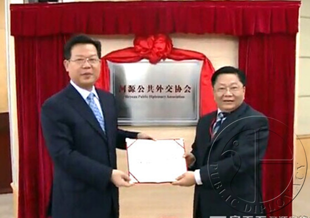 11月26日上午,河源公共外交协会正式成立。广东公共外交协会会长汤炳权,省侨办主任、广东公共外交协会副会长吴锐成到会祝贺并为协会揭牌。市长彭建文致辞,市政协主席龚佐林主持成立仪式。