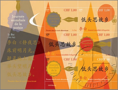 即将到来的3月21日是世界诗歌日,为此今年联合国邮政将发行一套邮票,共有6个小全张总共36枚邮票,分别选取了英语、西班牙语、汉语、法语、阿拉伯语、俄语六种世界主要语言的代表性诗歌进行展现。其中,汉语诗歌选取了中国唐朝著名诗人李白脍炙人口的作品《静夜思》。