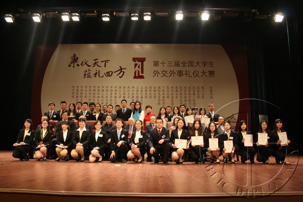 由外交学院主办的“秉仪天下 蕴礼四方·第十三届全国大学生外交外事礼仪大赛”决赛,于2014年11月23日上午在外交学院沙河校区举办。原外交部礼宾司代司长、首任驻斯洛文尼亚共和国大使鲁培新、原礼宾司司长、前驻多哥、布隆迪大使江康、首任中国中东问题特使王世杰、中国中东学会副秘书长殷罡、外交部新闻司一等秘书王培军、外交部团委副书记朱佳、新华社世界问题研究中心研究员顾正龙、中国人民对外友好协会办公厅礼宾处处长刘芳、人民日报海外版编辑、记者、通联部主任张燕萍以及人民日报前通联部主任王京生等多名德高望重的前高级外交官和在公共外交领域卓有建树的领导、学者作为嘉宾出席了大赛。原外交学院副院长、原外交部礼宾司副司长张直鑑、前驻美使馆公使董补明、原外交部礼宾司副司长孙淑贤、前外交部礼宾司参赞马保奉等资深外交专家担任大赛评委,外交学院党委副书记郑启荣出席了大赛。经过前一日的预赛,北京外国语大学,中国政法大学,复旦大学,中央民族大学,北京第二外国语学院,外交学院六支高校参赛队从二十九支代表队中脱颖而出,晋级此次决赛。