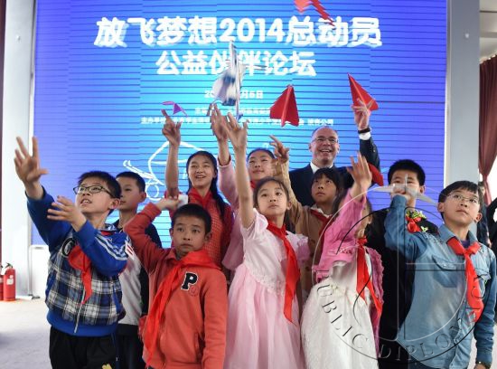 波音中国总裁唐义恩与来自“波音少年航校”的学生代表们共同开启2014“放飞梦想”活动。
