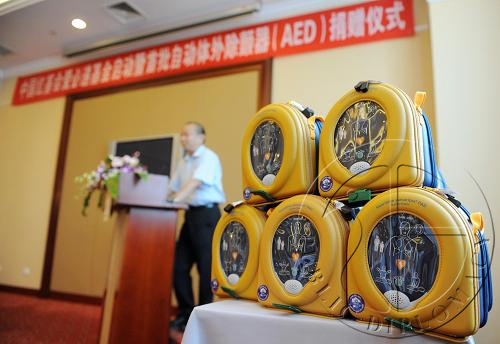 中国红基会常务副理事长孙硕鹏在致辞中介绍,我国每年因心脏性猝死人数达54万人,为避免和预防病人在公共场所突发心脏猝停,第一时间抢救生命,中国红基会在旅加华侨姜宪委先生的推动下、在北京嘉联诚业医疗器械销售有限公司捐助下,发起了爱必递基金。该基金旨在广泛动员国内外的社会力量,募集资金和心脏急救用智能体外除颤器等急救医疗设备,广泛开展针对公众的心肺复苏术(CPR)技能培训活动,在公众场所及社区安置智能体外除颤器,使公众在公共场所发生心脏紧急状况时能及时免费享有体外除颤服务。