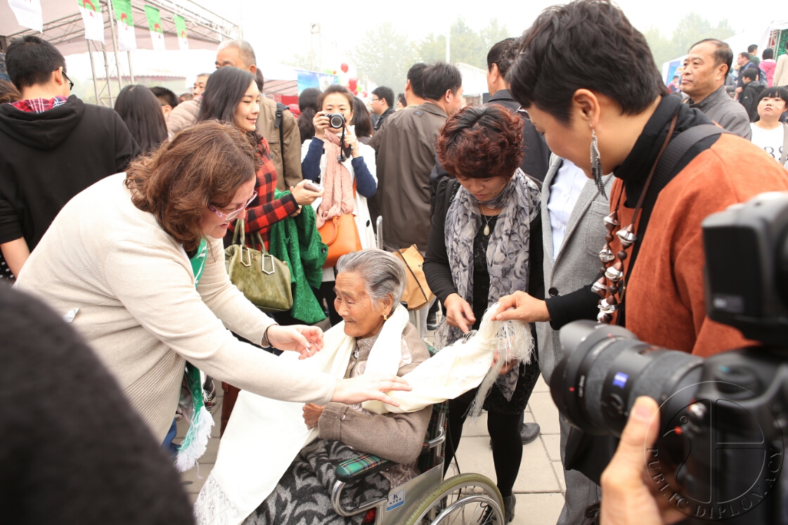 阿尔及利亚大使夫人(左一着白衣)亲切地为马会长母亲(居中)围上阿国的丝巾