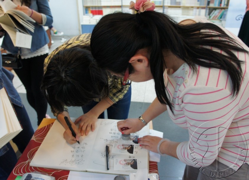 朗读者结束下台,在签名簿上留名,并领走一枚印有马尔克斯头像的盖章小卡片