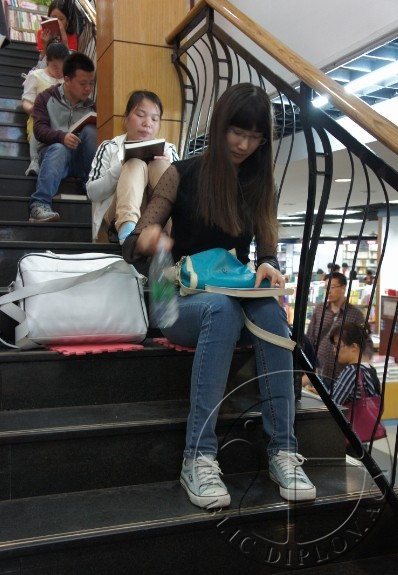 活动开始前6时许,记者来到三联书店地下一层学术区,发现想要朗诵的读者已经排起了二十余人的长队。此外书店还准备了好多纸质坐垫,也有读者就着坐垫安静地坐在地上,等待聆听这一场诵读接力。