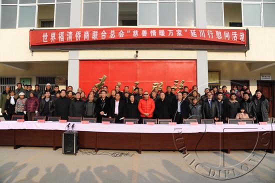 在陕西省延川县文安驿镇镇政府大院,2015年世界福清侨商联合总会“慈善情暖万家”慰问活动近日举行。世界福清侨商联合总会副主席林荣代表世界福清侨商联合总会向延川县慈善协会捐赠慰问善款30万元,延川县人民政府常务副县长宋满红向世界福清侨商联合总会颁发证书及牌匾。本次慰问还惠及延水关镇、乾坤湾镇、大禹街道办及延川县社会福利服务中心的贫困老人、贫困母亲、抗战老兵、留守困难儿童。