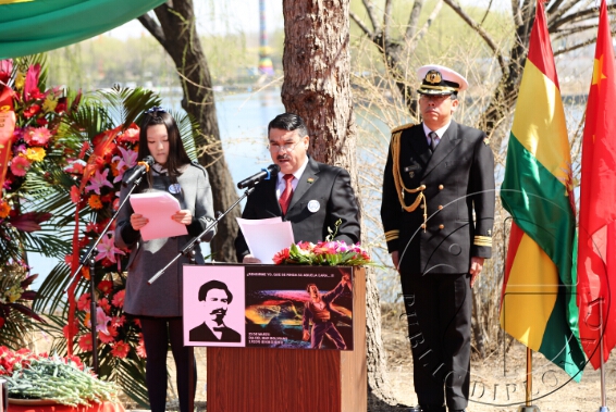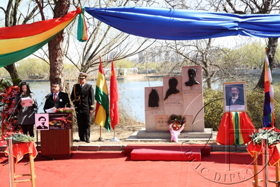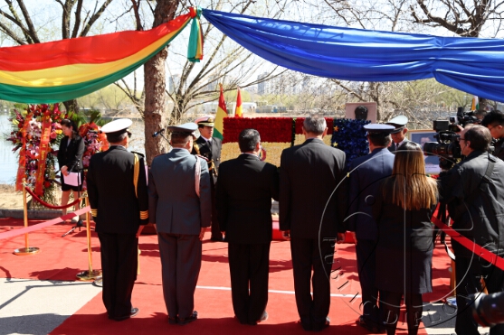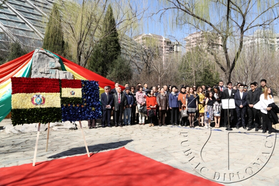 在奏响玻利维亚和中国国歌后,玻利维亚驻华大使吉列尔莫·查卢普·连多与使馆工作人向玻利维亚三英雄纪念碑及南美太平洋战争英雄爱德华多·阿巴罗阿·伊达尔戈画像献花。据悉,纪念碑由金台艺术馆馆长袁熙坤创作,以纪念玻利维亚民族争取独立、自由与主权历史上的三位重要人物,分别为图帕克·卡塔里、胡安娜·阿苏杜伊与桑塔·克鲁斯元帅。