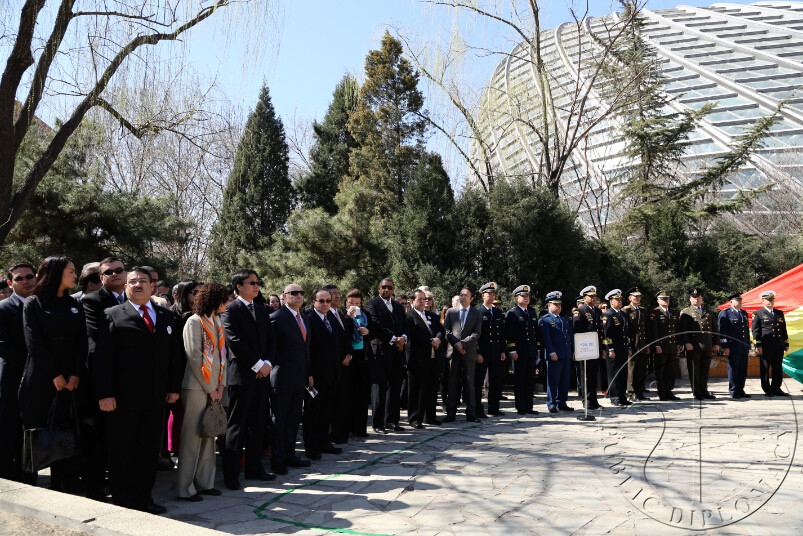【公共外交网讯】2015年3月23日上午,玻利维亚“海洋日”纪念活动在北京朝阳公园国际友谊林举行。玻利维亚驻华大使吉列尔莫·查卢普·连多,中国外交部、国防部领导代表,中外现任、前任外交官及社会各界人士共百余人出席了活动。