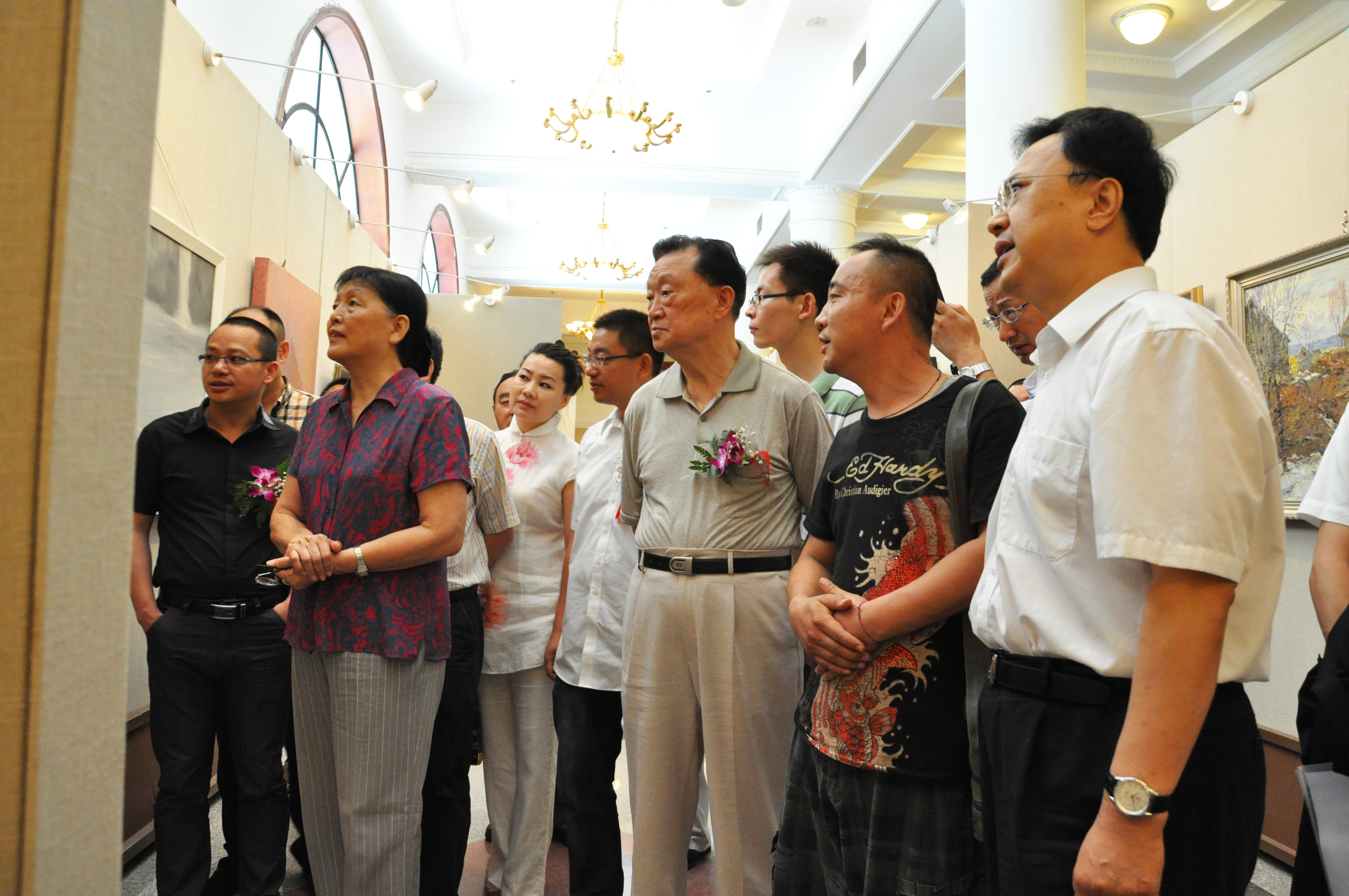 嘉宾与书画家一起欣赏展出的作品