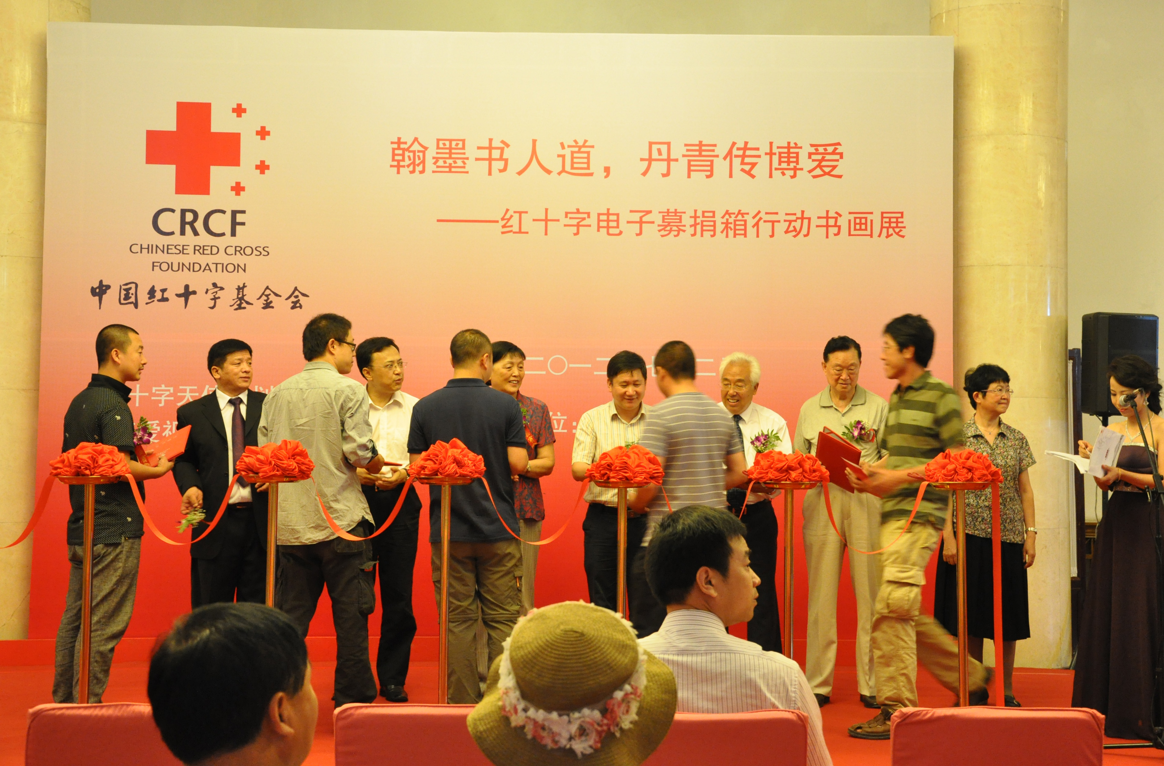 由中国红十字基金会主办的"翰墨书人道,丹青传博爱--红十字电子募捐箱"公益书画展在全国政协礼堂隆重开幕。全国政协副主席张梅颖,中国红十字会副会长、中国红基会理事长郭长江,中国红基会秘书长刘选国,原中共中央办公厅秘书局局长傅西路、博爱视窗项目负责人杨春彦,中国美术家协会和中国书法家协会的理事、会员以及油画艺术家等二百余人出席了公益书画展的开幕式。
