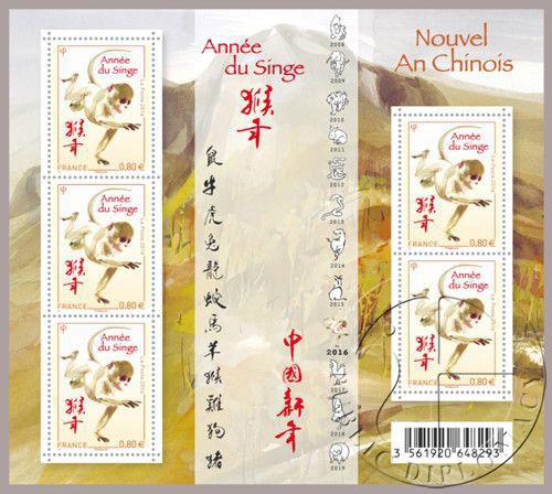 据法国《欧洲时报》报道,在法国国家邮政总局在连续11年发行鸡年、狗年、猪年、鼠年、牛年、虎年、兔年, 龙年,蛇年,马年和羊年农历中国生肖纪念邮票之后,2016年将继续发行法国中国生肖邮票猴年邮票,这将是法国发行的中国生肖邮票中最后一枚生肖纪念邮 票。猴年邮票设计权仍然被旅法艺术家李中耀夺得,这也是他第10次单独夺得生肖邮票设计权。