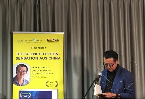 据悉,德文版将于12月上市,这次活动上使用的是试读本。活动在孔子学院法兰克福分部举行。刘慈欣表示,很高兴作为《三体》的作者来到德国法兰克福与大家见面,“坦率地说,十年前写作这本书的时候我确实想不到有今天,当时如果有人跟我说中国的科幻作家能在美国、欧洲、西方世界得到读者的喜爱,我就会劝他说干脆你去写科幻,别让我来写。”