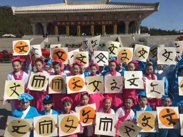 活动现场,来自黄陵县小学和桥山中学百名学生运用不同书法字体共同书写“字说黄陵”之“文”字。小“书法家”们身着传统服装书写毛笔字,他们将是传承和弘扬优秀传统文化的骨干力量。