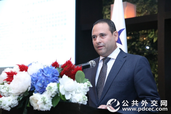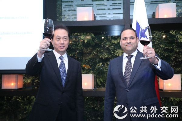 【公共外交网讯】2019年6月13日晚,巴拿马驻华使馆在北京瑰丽酒店举办红酒招待会,庆祝中国同巴拿马建交两周年。巴拿马驻华大使施可方,中国外交部副部长王超,中外各界友好人士等百余人出席招待会。