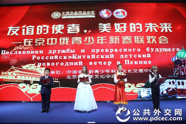 【公共外交网讯】2019年1月13日,由中国宋庆龄青少年科技文化交流中心和北京俄罗斯文化中心联合主办的“友谊的使者·美好的未来”—— 在京中俄青少年新春联欢会在京举行。参加联欢会的嘉宾有中国宋庆龄基金会国际合作交流部部长陈爱民、俄罗斯驻华大使馆参赞、俄罗斯国际人文合作署驻华代表处负责人、北京俄罗斯文化中心主任梅利尼科娃·奥莉加、中国宋庆龄青少年科技文化交流中心副主任任海峰以及在京中俄友好人士和青少年代表。