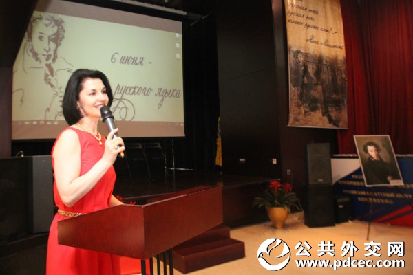 俄罗斯国际人文合作署驻华代表处负责人奥莉加·梅利尼科娃致欢迎辞,介绍了6月6日俄语日的来历及普希金对俄语、 俄罗斯文学、文化和世界文学、文化的发展所作出的巨大贡献。