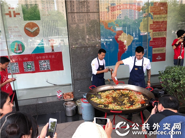 活动现场,大厨们为参加活动的朋友们烹制着西班牙海鲜饭,大虾、贻贝、鱿鱼等各色海鲜配上香米、藏红花和各种香料,在节日的欢声笑语中煎炒、蒸腾,散发出让人垂涎的味道。不一会儿,等饭的队伍形成了色彩斑斓的长龙。