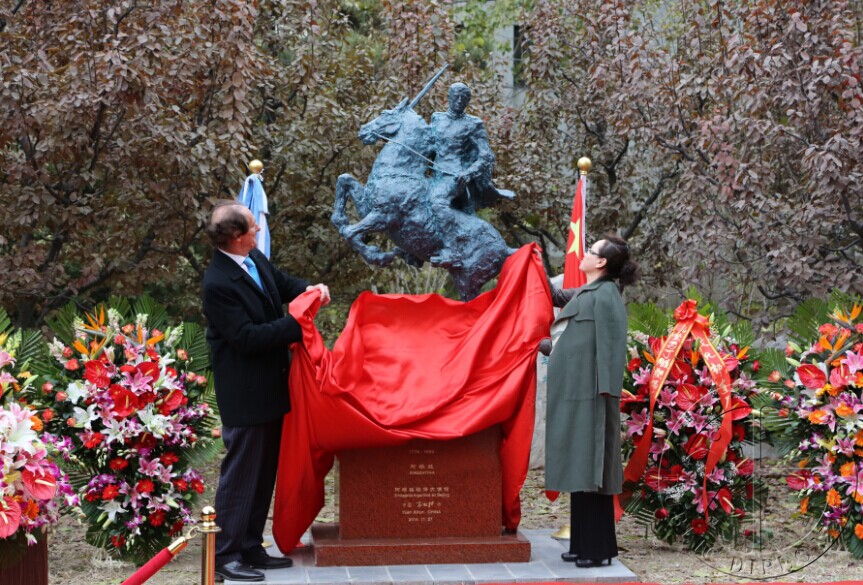 在先后奏响阿根廷国歌和中国人民共和国国歌之后,阿根廷驻华大使古斯塔沃·马蒂诺和文化部机关党委副巡视员何晓娟女士为圣马丁将军雕像揭幕并献花。雕塑中“南美解放者”紧勒缰绳端坐在前蹄腾空跃立的骏马上,仿佛奏着凯哥向着胜利的前方驰骋,圣马丁将军的眼睛坚定而温柔地注视着无数期盼他的解放与救赎的人民。据悉圣马丁将军雕像由金台艺术馆馆长、著名造型艺术家袁熙坤于2013年底受阿根廷驻华使馆之邀而创作,一共有两座,其中一座自今年5月起至今,在美国华盛顿美洲艺术博物馆举行的“中国艺术家眼中的美洲——袁熙坤雕塑艺术作品展”中展出并被博物馆收藏;而留在中国的这一尊将在朝阳公园永久展出,接受所有在华拉美侨民的缅怀。