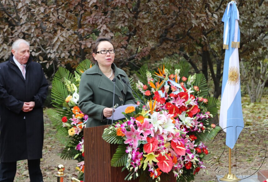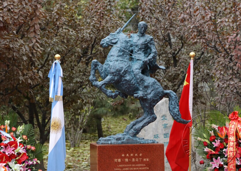 【公共外交网讯】11月27日,为庆祝南美洲“解放者”、阿根廷国家英雄何塞·德·圣马丁将军雕像落户北京朝阳公园,阿根廷驻华使馆和北京金台艺术馆联合举办了庄重的揭幕仪式。拉美使团各国大使、使节及武官,拉美在华侨民,中国外交部拉美司、中国文化部等政府官员、中国原驻拉美外交官、中阿(根廷)商会驻京代表等社会各界友好人士应邀出席本次活动。