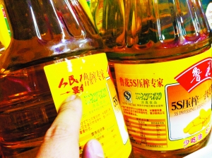 记者昨天走访一些大型超市发现,鲁花各类产品包装的“人民大会堂宴会用油”字样看不见了,取而代之的是一层明显后来粘贴上去的“鲁花5S压榨专家”粘纸,产品的生产日期大部分为10月24日。