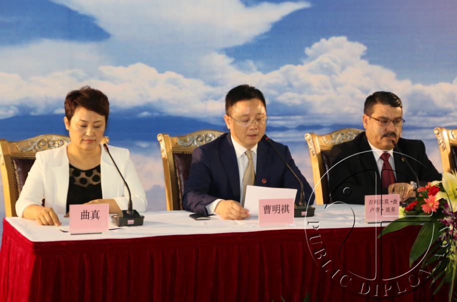 Le lieu de la conférence de presse, de gauche à droite, le vice-président Qu Zhen, le vice-président et le secrétaire général Cao Mingqi du Centre de la Diplomatie publique & des échanges culturels,Ambassadeur bolivien M.Guillermo Chalup Liendo