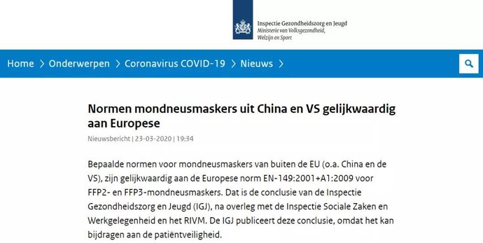 另一欧洲国家荷兰医疗保健及青少年监察局官方网站公布,为保障疫情期间个人防护用品和医疗器械产品的充足供应,经荷兰社会事务及就业部(SZW)与荷兰国家公共卫生与环境研究院(RIVM)评估,中国部分口罩标准与相关欧洲标准等效。