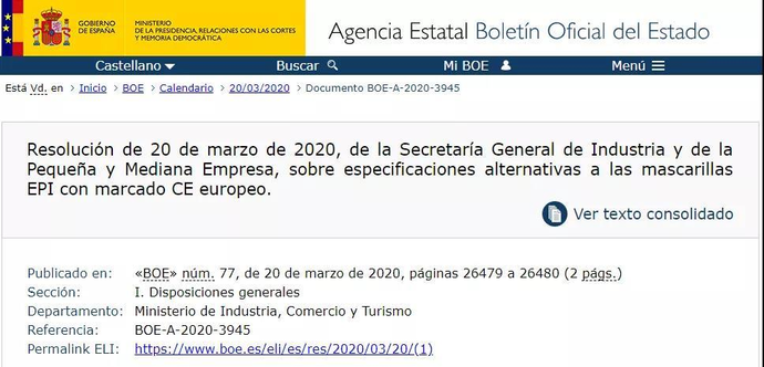 针对新冠肺炎疫情期间带CE标识的个人防护用品市场短缺的现状,近日,西班牙工业和中小企业部发布决议,公布中国口罩相关标准可替代欧洲标准。