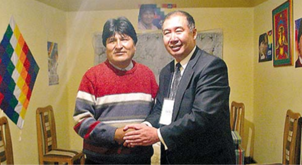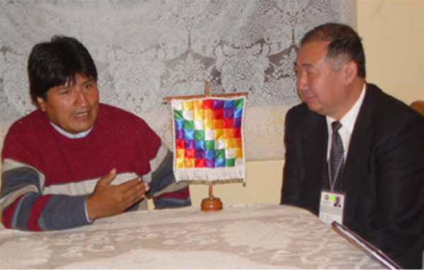 2005年底,左翼领袖莫拉莱斯在大选中获胜,成为玻利维亚首位印第安人总统。莫在在野期间,我就一直与他保持非常好的关系,我到任后的第一次国庆招待会上,他就作为当时全国第二大政治力量领袖亲自参加,后来还几次到我的官邸出席宴会。平时,我们之间甚至以兄弟相称,我还受他邀请参加了该党的代表大会,在场引发了数千名代表的热烈欢呼。大选获胜后不久,莫拉莱斯即与我联系,希望马上访华。2006年初,莫应中国政府邀请,以候任总统名义正式访华,受到我国高规格接待。作为拉美国家的总统在还未就任的情况下就访问中国,这种外交行动非常罕见,充分体现出他对玻中关系的重视和寄与的厚望。我在委内瑞拉担任大使期间,莫应查韦斯总统的邀请出席中国为委内瑞拉发射卫星的仪式,我们再次见面,他盛情邀请我回玻看看。在2018年莫拉雷斯总统访华期间,莫在社科院发表演讲并推介他撰写的自传 “我的人生”,活动结束时,总统先生走下讲台与在座嘉宾握手,虽已时隔十年未谋面,但他一下就认出我来,与我紧紧握手寒暄,令我很受感动。