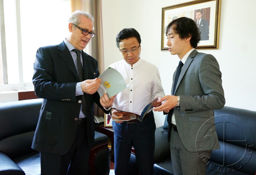摩洛哥驻华大使贾法尔·阿尔热·哈基姆(左)向马振轩会长(中)展示摩洛哥相关资料