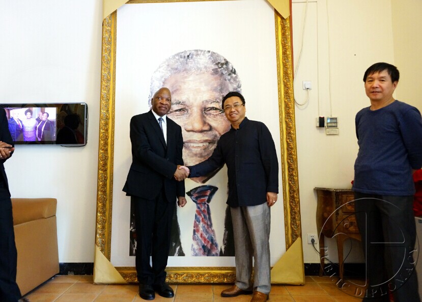 中非艺术与文化交流可以通过不同的方式与途径。马振轩会长在与南非驻华大使兰加的会见中表示,非洲艺术因扎根于自身丰饶的历史与文化土壤而别具一格,其中尤属非洲绘画与木雕,在世界艺术的星空中大放异彩。中心曾举办以木雕为主体的“远古的凝视”非洲艺术展,给中国观众留下了极为深刻的印象。而非洲历史上层出不穷的精神领袖和伟人英雄,既是非洲坚韧不屈的文化精髓的代表,也是中国艺术家进行非洲题材创作时的原型和灵感来源。公共外交中心画家于成松先后以南非人民精神领袖曼德拉和其他非洲国家元首为原型,以中国水墨画的艺术表现形式创作了一系列非洲领袖大写肖像画。马会长提出希望在曼德拉诞辰纪念日将伟人画像赠予南非使馆展出,以表达中国人民对这位英雄的崇敬与怀念,兰加大使欣然应允。通过长期的文化艺术交流和各类活动的协作与互动,中心与非洲各国驻华使馆建立起了牢固的友好合作关系。加蓬驻华大使让·罗贝尔·古隆加纳是筹备今年“非洲日”庆典的执行负责人,他与马振轩会长在密切的沟通与配合中建立了深厚的友谊。大使在会见马会长时表示,加蓬总统阿里·邦戈若如期在年内访华,使馆将考虑安排总统先生参观访问公共外交中心。这也显示了加蓬使馆对中心的重视。