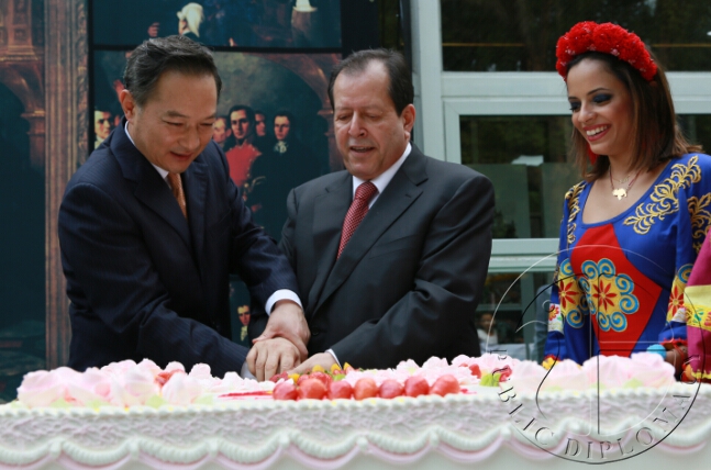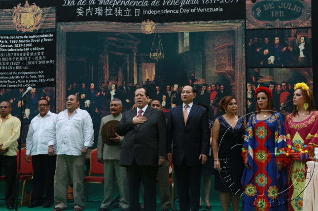 中国外交部部长助理张昆生与委内瑞拉驻华大使伊万•塞尔帕•格雷罗带领大家唱国歌