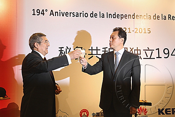 随后,中国外交部副部长王超与卡普纳伊大使共同举杯,庆祝秘鲁共和国独立194周年,并祝愿中秘两国友好合作关系得到进一步巩固和发展。