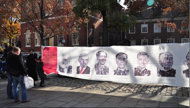 展览现场,由二十名在宾西法尼亚大学留学的中国女生,高举画有孙中山、毛泽东、邓小平、江泽民、胡锦涛、白求恩、马海德、安娜•路易斯•斯特朗、埃德加•斯诺、爱泼斯坦、史沫特莱等人物肖像的宽一点五米、长一百米的画卷,从费城中国城走到独立广场,在独立宫门前一字摆开,吸引着众多不同语言,不同肤色,不同年龄的人们驻足观看。很多人伸出大拇指,用生硬的中国话连呼“太棒了”“太棒了”,争先与作品合影留念。一位在宾州政府工作的雇员说:我从未见过如此精美的巨幅画卷。费城老侨领陈启庄惊呼“太像了”。家住纽约长岛的黄宏图先生一大早就驱车三个多小时赶来费城观看,并说“难得”。正在广场参观的一位黄姓中国游客拿起相机连拍数十张照片,说是要带回去让朋友们看看。