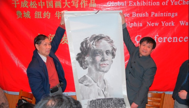 上午十一时,于成松中国画大写作品费城、纽约、华盛顿巡展新闻发布会在费城中国城东方明珠大酒店举行。会上,精英会会长管必红介绍于成松是独特精通油画和中国水墨画的著名画家。是中国官方派往南极作画并在南极举办个人画展的世界第一位画家。他用自己创造的艺术形式创作的《四川风光画集》系列六部画集,曾被选作联合国第四次世界妇女大会纪念品;他的34卷一套的《中国风光画集》,曾被第29届奥林匹克运动会组委会选为礼品画集。于成松融汇东西方艺术神韵于一体,用中国画大写意的艺术形式,创作的百位新中国历代领导人、为中国革命事业做出杰出贡献的各界代表人士和国际友人的肖像作品,惟妙惟肖,栩栩如生,气势磅礴,振奋人心。成为具有划时代意义、里程碑性质的历史巨作。于成松本人也在新闻发布会上介绍了自己的创作思路和历程。他说:父亲曾经留给我一句话:要记住怎么得来的饭,要记住帮助过自己的那些人。自己在南极收集创作素材时的遇险经历,使自己更加感受到强大的祖国就是自己生命坚定的保护神。通过画笔把胸中的感受幻化出来,创作出百位人物肖像,献给帮助自己好好活着的人,献给自己的祖国,献给生命的保护神。于成松还说:他的南极之行,使他感受到我们的地球并不是无边无际,宇宙中小小的地球村的人们,就是一个大家庭,我们这个家庭中的每一位成员,都应该互帮互爱,有福同享,有难同担。举办自己作品世界巡展,是想把这些感受与大家共同分享。在新闻发布会上,于成松将马海德、安娜•路易斯•斯特朗、埃德加•斯诺、史沫特莱等国际友人的肖像作品托交精英会领导转交给国际友人的亲属和家乡。
