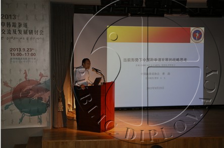 【公共外交网讯】9月23日下午,由中国跆拳道协会、跆拳道振兴财团、驻华韩国文化院和大韩民国驻青岛总领事馆联合主办的中韩跆拳道交流及发展研讨会在北京驻华韩国文化院举行。