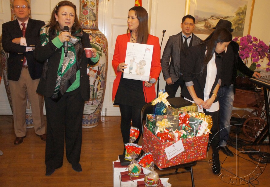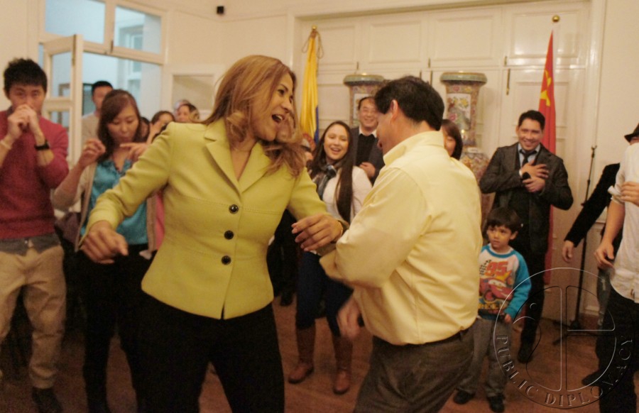 礼物分发将派对的气氛推向高潮,在哥伦比亚歌手富有激情的歌声中,每一个人都投入了节日前的这一场狂欢;这一刻不分国籍、不分彼此,班布科舞蹈奔放的舞步与热烈的节奏将场上每一个人对生活的热爱融化在一起。(文/公共外交网记者黄瑜蓉)