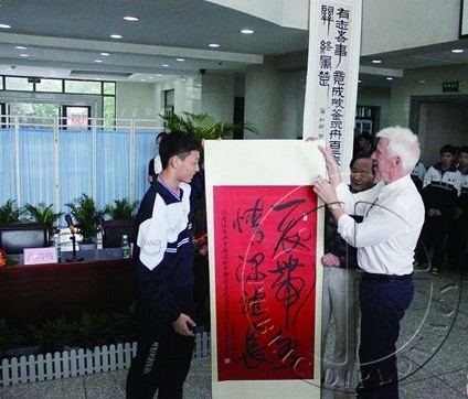 10月24日,长沙长郡双语实验中学科技楼,贾宇峥(左)向瑞典雪德波特高中文化交流团团长Thomas先生赠送自己的书法作品