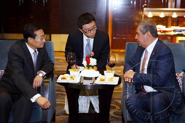 用餐时张明副部长同阿驻华大使拉贝希就中阿关系等共同关心的问题交换了意见。(文/公共外交网记者辛晓娇)