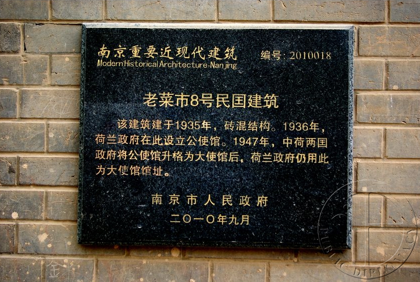 水佐岗老菜市6号的原荷兰大使馆为省级文保单位。几年前,这里曾经是南京三乐集团分厂的所在地,而如今厂房都已经拆迁,只剩下老菜市6号这座孤零零的民国建筑。记者在现场看到,这处砖木混凝土结构的两层楼房,因为年久未修缮而显得格外破败,外墙看上十分斑驳,不少砖块都已经风化了,坑坑洼洼的,门窗玻璃也破碎了不少。不过建筑风格很有范,灰砖墙、灰筒瓦,檐头每个筒瓦上均有一个五角星,显示着它的不凡身世。根据史料记载,1936年3月,荷兰政府任命傅恩德为驻华公使馆特命全权公使,9月17日来宁履任,当月19日向国民政府主席林森呈递国书,并买下1936年前所建的老菜市29号(现老菜市6号)为公使馆。1947年3月29日,中荷两国政府将公使馆升格为大使馆后,荷兰政府任命艾森为首任驻华特命全权大使,仍以此为大使馆馆址。原荷兰大使馆有两栋,如今仅剩这栋二层、8间的楼房。