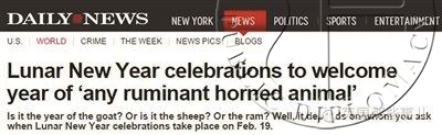 首先抛出问题的是英国曼彻斯特的一家媒体,新闻的大标题开宗明义:“曼彻斯特的中国春节:究竟是哪一种羊?”纠结的不仅仅是英国人,CNN等美国媒体同样抓狂,直接就指定了一种羊。比如说华尔街日报,直接就认定是山羊。今天,又有媒体认为是绵羊。而最“聪明”的,当属 纽约时报,他们避开了对究竟是哪种羊的讨论,直接把羊年定义成了“各种有角反刍动物年”。
