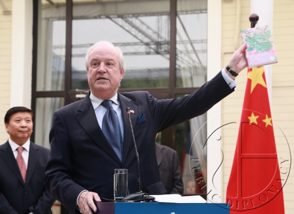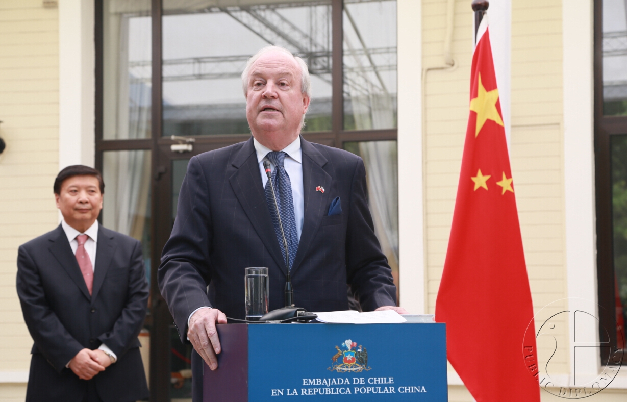在奏过智利共和国与中华人民共和国国歌后,贺乔治大使发表致辞,他表示,自1970年智利成为南美洲第一个与中国建交国家以来,中智双边友好关系持续发展。2015年,将是智利与中国建交45周年及自贸协定签署10周年,长期以来,智中均坚守开放的经济,信守自由贸易协定,不为世界经济的洪流开启阀门,两国的经贸繁荣进步正基于此。巴切莱特总统2013年再次就任后,两国高层互访频繁,两国关系不断深入发展,11月下旬,巴切莱特总统还将来京出席2014年APEC会议。
