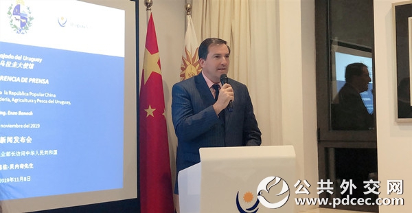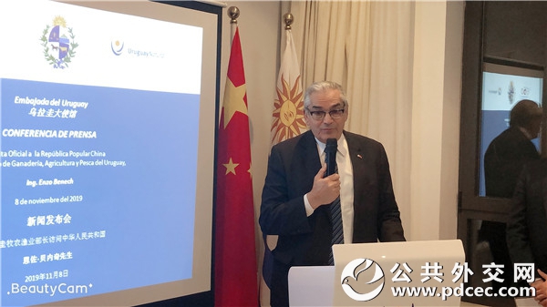 【公共外交网讯】2019年11月8日,乌拉圭牧农渔业部长访华记者招待会在北京举行。乌拉圭牧农渔业部长恩佐·贝内奇、乌拉圭驻华大使费尔南多·卢格里斯、驻京各大媒体代表参加活动。