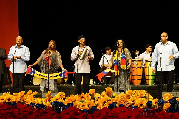 此次音乐会的表演者是来自委内瑞拉著名的“弗朗西斯科•巴切克音乐组合”,共带来11首曲目,其中包括多种音乐风格,有委内瑞拉南部传统音乐《我的启明星》,有狂欢色彩的舞曲《塞西莉亚—卡亚奥的女神》,还有乐队原创的圣诞颂歌舞曲《屋角》等。公共外交文化交流中心画家于成松在去年查韦斯逝世一周年的时候赠送的查韦斯大幅画像,在今天的音乐会上高高悬挂在舞台上。伊万•塞尔帕大使和其他外交官及家属,手举委内瑞拉国旗,伴随着时而悠扬时而欢快的旋律从第一支舞曲一直舞动到最后。