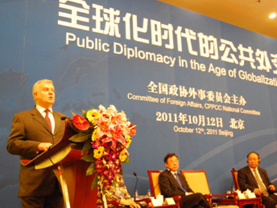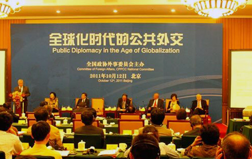 本站讯2011年10月12日,由全国政协外事委员会主办的“全球化时代的公共外交”座谈会在全国政协礼堂举行,座谈会由全国政协外事委员会副主任、商务部原副部长马秀红主持,来自全国和地方政协、中央和国务院有关部委、部分高校和研究机构以及新闻媒体的近120位来宾出席了本次座谈会。中外公共外交领域的专家学者在座谈会上发表演讲并展开交流,共同探讨推动公共外交为我国和平发展创造良好的外部环境。