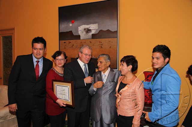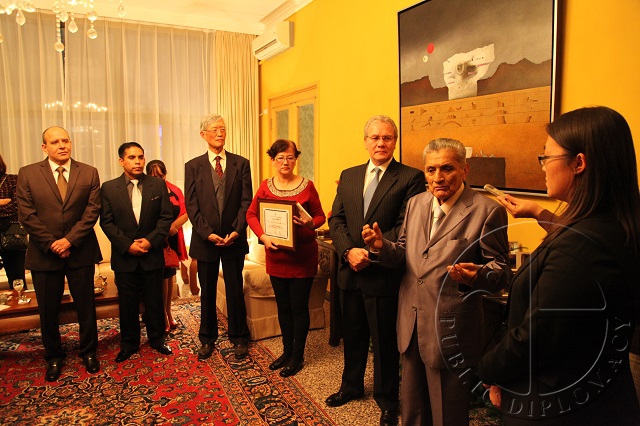 [公共外交网讯] 10月18日晚,中国人民的老朋友、秘鲁友人安东尼奥·费尔南德斯·阿尔赛(Antonio Fernandez Arce)的表彰仪式在秘鲁驻华使馆举行。秘鲁驻华大使贡萨洛·古铁雷斯阁下、拉美驻华外交官、中国原驻拉美外交官、阿尔赛的家人与朋友们约百余人出席了表彰仪式。