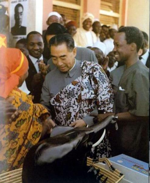 1965年6月,周恩来访问坦桑尼亚时,接受非洲民族联盟元老赠送民族服装。